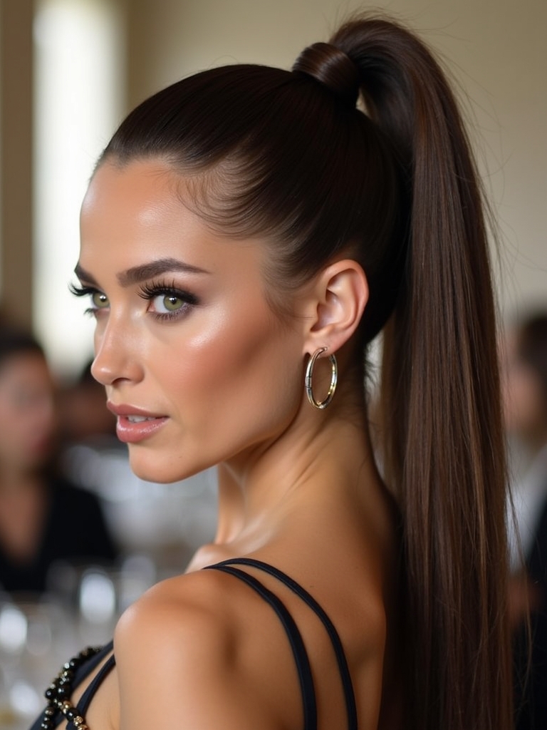 A polished high ponytail is powerful, sleek, and incredibly modern, lifting the face and accentuating your bone structure. This hairstyle adds a fierce edge to a Fancy Date Night Outfit, showing that you are confident and stylish. It works exceptionally well with a Fancy Dinner Outfit that features a plunging neckline or a busy pattern, as it keeps the silhouette clean. As you try on Outfits For Dinner, you will notice that a high pony elongates your neck. It is a bold choice for Dinner Date Outfits, moving away from traditional curls to something more architectural. At a Fancy Dinner, you want to look put-together, and a high ponytail wrapped with hair to hide the tie does exactly that. For a casual yet chic Date Dinner, this style keeps you cool and comfortable. Match this look with tailored Dinner Outfits like a blazer dress or a jumpsuit. In the realm of Date Outfits, the high pony is synonymous with high fashion. Finally, for Night Outfits, smooth down edges with gel for a glass-hair finish that shines under city lights.